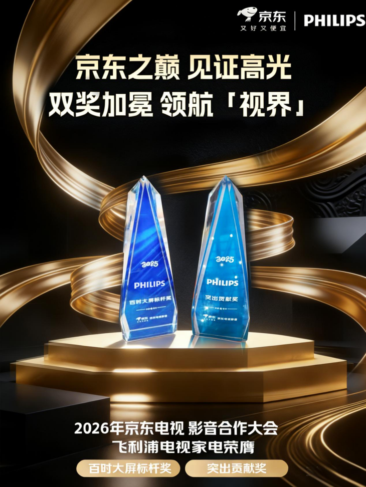 1月22日,2026 京東電視影音合作伙伴大會暨游戲電視標準發布 & 年貨節啟動儀式圓滿落幕,荷蘭皇家品牌飛利浦電視作為核心合作伙伴重磅出席。大會現場,飛利浦電視緊跟京東 “推高賣新” 戰略步伐,憑借890百吋MiniLED電視的硬核實力斬獲 “百吋大屏標桿獎”,同時依托線下與京東五星的深度協同榮膺 “突出貢獻獎”。雙料榮譽加持之下,飛利浦電視同步亮相京東電視影音年貨節啟動環節,以全渠道優勢與優質產品矩陣,為消費者帶來兼具科技感與年味的家庭影音升級方案。