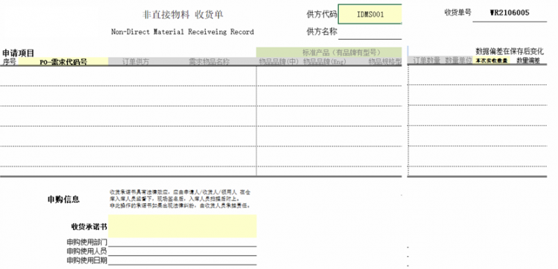收貨管理:在勤哲Excel服務器中,WR101倉庫收貨模塊支持非直接物料收貨操作,僅對倉庫人員開放。系統自動匹配供方及未完成收貨的PO,收貨數量精確校驗,避免重復或錯收。為防范財務風險,平臺強制上傳領用人簽名的收貨承諾書掃描件,實現收貨責任可追溯,保證數據透明和真實性。