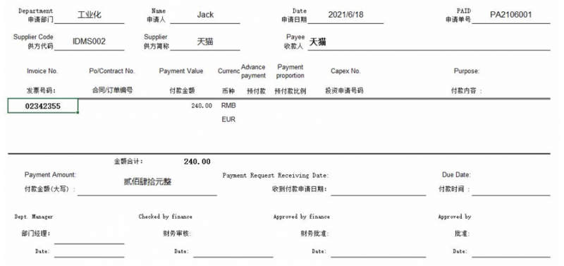 發票登記與付款閉環:在勤哲Excel服務器中,發票信息錄入通過P7-PA101完成,系統自動匹配采購項目、數量和單價,其余數據自動計算。用戶填寫發票號碼、金額、稅率和開票日期后,信息保存并可用于后續付款申請。付款通過P8-PA201提交,平臺僅顯示對應供方未付款發票,防止重復支付。付款申請需部門經理簽字,確保從采購到付款形成完整閉環,實現非直接物料采購流程的全程可控。