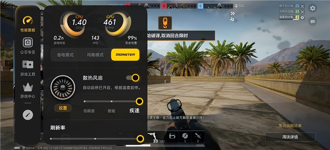 高性能的關(guān)鍵是能穩(wěn)定釋放,iQOO 15 Ultra 的冰穹風(fēng)冷散熱系統(tǒng)堪稱手游散熱天花板,也是本次評(píng)測(cè)強(qiáng)推的核心設(shè)置,開啟疾速模式 + 擋位拉滿 +關(guān)閉自動(dòng)啟停后,直接把 “高性能 = 高發(fā)熱”的行業(yè)痛點(diǎn)焊死!