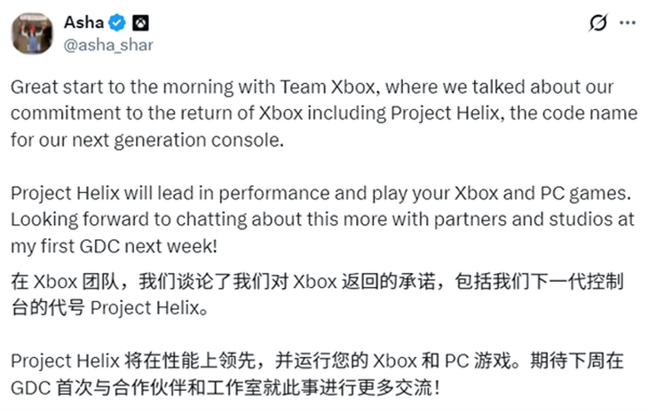3月6日消息,微軟新任Xbox CEO阿莎·夏爾瑪(Asha Sharma)在社交平臺首次公開表態,正式確認微軟下一代Xbox游戲主機的開發代號為Project Helix,并明確該機型將支持同時運行Xbox與PC雙平臺游戲,這也是微軟首次官方證實新一代主機將全面接入PC游戲生態,終結了此前長期流傳的市場傳聞。