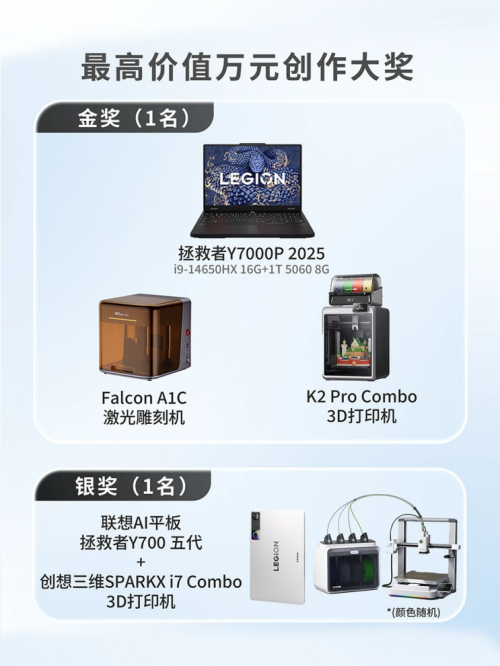 將原創3D模型上傳至「創想云社區」參賽專區并提交材料。大賽設置金、銀、銅及優秀、創意等多重獎項,獎品包含聯想拯救者Y7000P筆記本電腦、聯想AI平板拯救者Y700五代、創想三維K2 Pro Combo、創想三維Falcon A1C、創想三維SPARKX i7 Combo等豐富生態裝備。