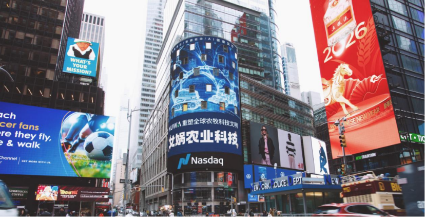 今年春節(jié)期間,女媧農(nóng)業(yè)科技首次亮相紐約時(shí)代廣場納斯達(dá)克塔樓大屏,在全球資本市場的中心位置點(diǎn)亮“中國農(nóng)牧科技”的名字。這一畫面不僅象征著中國農(nóng)業(yè)科技企業(yè)走向世界,也釋放出一個(gè)信號:全球農(nóng)牧產(chǎn)業(yè)的智能化變革,正在加速到來。