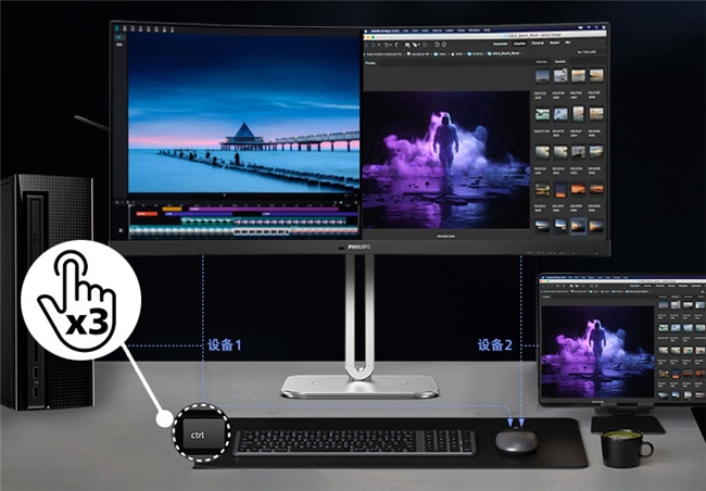 在整理數據、查閱資料時,能夠同屏顯示多個數據表格、文檔、PPT文件,不用來回切換窗口,減少縮放和滾動操作,信息就能一覽無余。同時配備PBP/PIP多源同屏技術,支持兩臺PC同屏顯示;內置Smart KVM功能,通過快捷鍵連按即可輕松實現鍵鼠控制切換,窗口切換更方便。