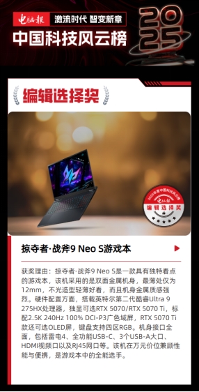 掠奪者·戰斧 9 Neo S一舉拿下《電腦報》“編輯選擇獎”與2025 TimeOut年度生活方式大獎,成為萬元價位的全能標桿。該機采用雙面金屬機身,最薄處僅12mm,磨砂質感搭配四區RGB鍵盤,兼具科技美感與握持手感,打破游戲本厚重刻板印象。硬件配置拉滿旗艦水準,搭載英特爾第二代酷睿Ultra 9-275HX處理器和RTX5070顯卡,配合高效散熱系統,高畫質運行3A大作依舊穩幀流暢。16英寸2.5K 240Hz 100% DCI-P3廣色域屏(RTX 5070Ti版本可選OLED屏)帶來沉浸式體驗,雷電4、全功能USB-C等全面的接口配置覆蓋各類需求,實現性能與便攜的完美平衡,既是游戲玩家與創意工作者的全能之選,更是兼具科技感與品質感的生活方式代表。