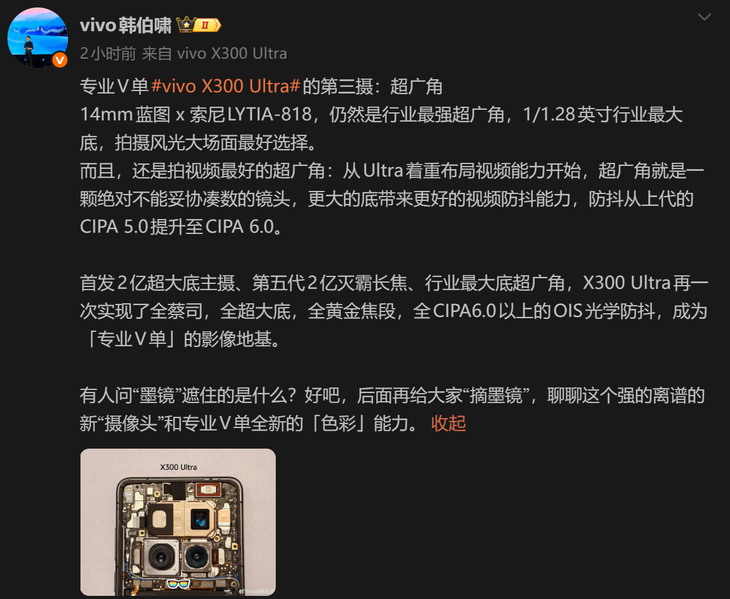 以往很多人認為手機的超廣角鏡頭只是“湊數”,即便在旗艦機上,整體素質也常常一般。不過,vivo產品經理韓伯嘯今日發文透露,即將發布的vivo X300 Ultra將搭載行業史上最強的超廣角鏡頭,徹底顛覆這種印象。該鏡頭配備14mm藍圖索尼LYTIA-818影像傳感器,擁有1/1.28英寸超大底規格,為視頻拍攝帶來更高畫質和更強防抖能力。