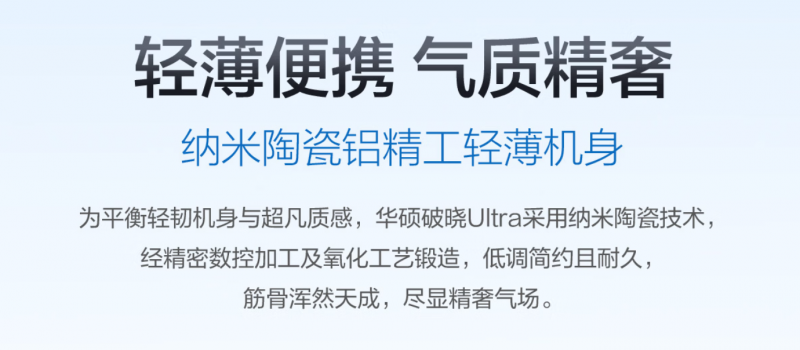 華碩破曉Ultra采用納米陶瓷鋁工藝打造,輕約1.1KG,薄至10.9mm可輕松收納于公文包;陶瓷灰配色溫潤內斂,出入各類高端商務場景,盡顯沉穩專業商務風范。
