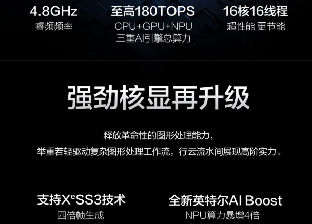 內置12Xe核心的Intel Arc B390核顯,圖形編輯性能翻倍提升,創意落地更加快捷;NPU提升至50TOPS AI算力,整機總AI算力高達180TOPS,為用戶日常AI辦公注入強勁動能,無論是本地語言模型應用、還是AI輔助生成PPT及處理圖像,都能獲得流暢體驗。