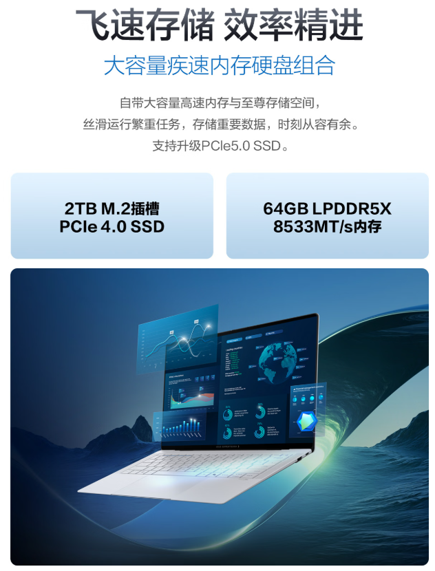 華碩破曉Ultra裝配64GB LPDDR5X 8533MT/s高頻內存,支持軟件并行、網頁多開、大數據模型分析、視頻導出預覽等場景疾速運行;2TB PCIe 4.0 SSD為用戶提供海量存儲和極致讀寫速度,支持RAID 0/1,為重要商業資料提供雙重保障。