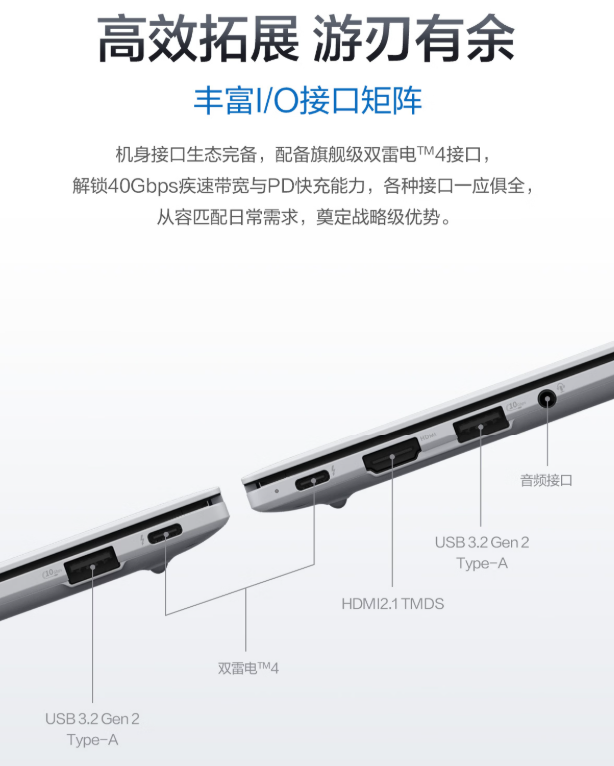 機身兩側接口豐富:2 x 雷電4,2 x USB 3.2Gen2 Type-A,1 x HDMI 2.1 TMDS,1 x 音頻接口,接口完備,滿足商務精英們多屏顯示、外設連接、手機充電、移動硬盤文件存取、等擴展連接需求,提升工作效率,為用戶搭建一站式辦公指揮中心。