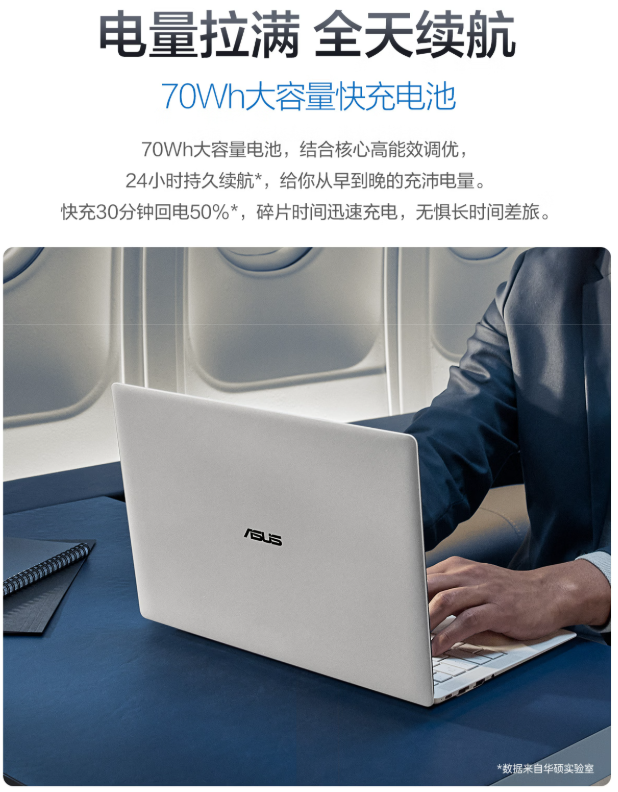 內置70Wh大容量電池,配合處理器能效優化,本地視頻播放續航可達24小時,輕松支撐全天差旅。即使電量告急,PD快充30分鐘即可回電50%,候車等待時間即可迅速為整機回電。