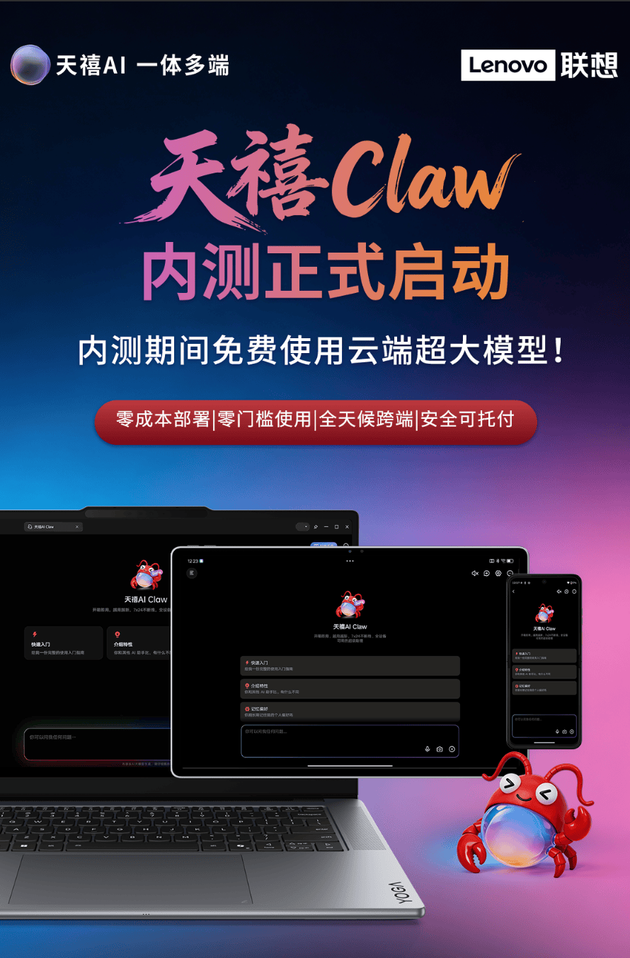 沒錯,用戶苦“陪聊AI”久矣。我們不僅需要AI能提供信息,更需要的是一個深植于系統之中、不僅能聽懂指令,還能真正替用戶操作設備、執行復雜任務的專屬超能搭檔。為此,聯想于3月18日正式發布天禧Claw,而隨著3月30日先鋒計劃內測的全面開啟,我們終于看到了AI從“對話工具”向“生產力搭檔(Agent)”跨越的真實模樣。