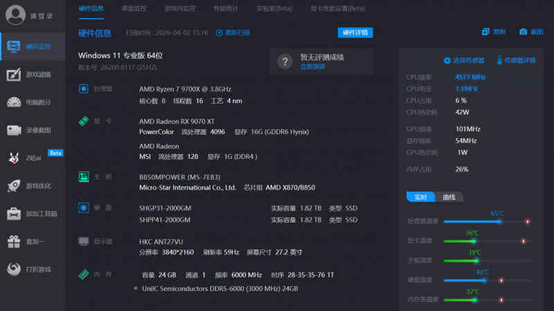 以往大部分測試都是在清空后臺的理想環境下進行,導致很難反映真實情況。而這次我們直接后臺掛上微信、Steam、加速器、語音軟件,再一口氣開20個網頁來模擬真實的用機狀態。同時,由于是給單條內存的玩家做參考,所以內存方面也只使用單條24GB,完整配置各位直接看圖。