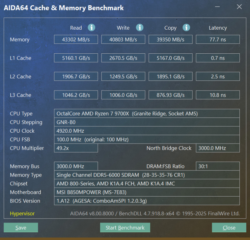 在AIDA64中,雖然單通道的讀寫帶寬沒法和雙通道硬剛,但延遲還是被壓在了77.7ns。對于AMD平臺來說,只要延遲夠低,日常體驗也不會有太大影響。