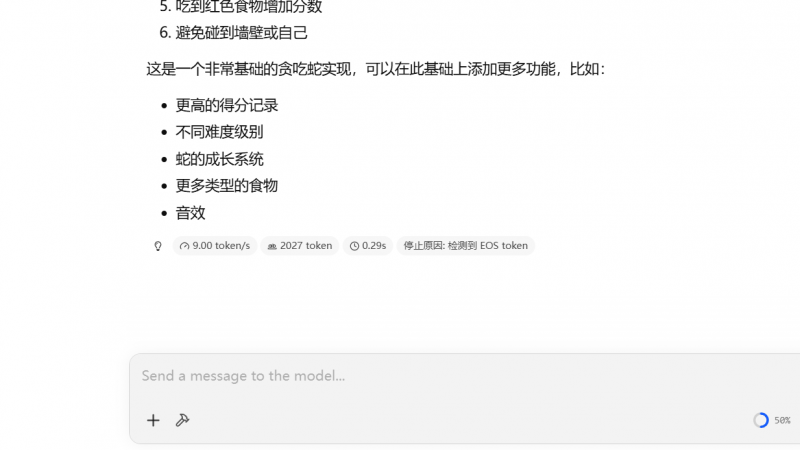 qwen-14B本地模型對話中,生成一個貪吃蛇游戲速度9token/s。
