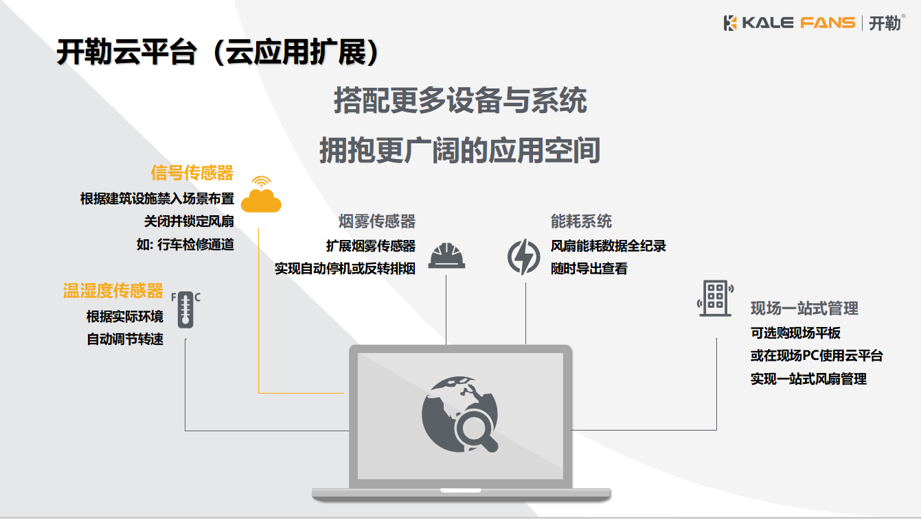 開勒云平臺還支持擴展更多設備與系統(tǒng),包括信號傳感器(根據建筑設施禁入場景布置關閉并鎖定風扇)、煙霧傳感器(實現自動停機或反轉排煙)、溫濕度傳感器(根據實際環(huán)境自動調節(jié)轉速)、能耗系統(tǒng)(風扇能耗數據全紀錄、隨時導出查看),以及現場一站式管理(可選購現場平板或在現場PC使用云平臺實現一站式風扇管理)。