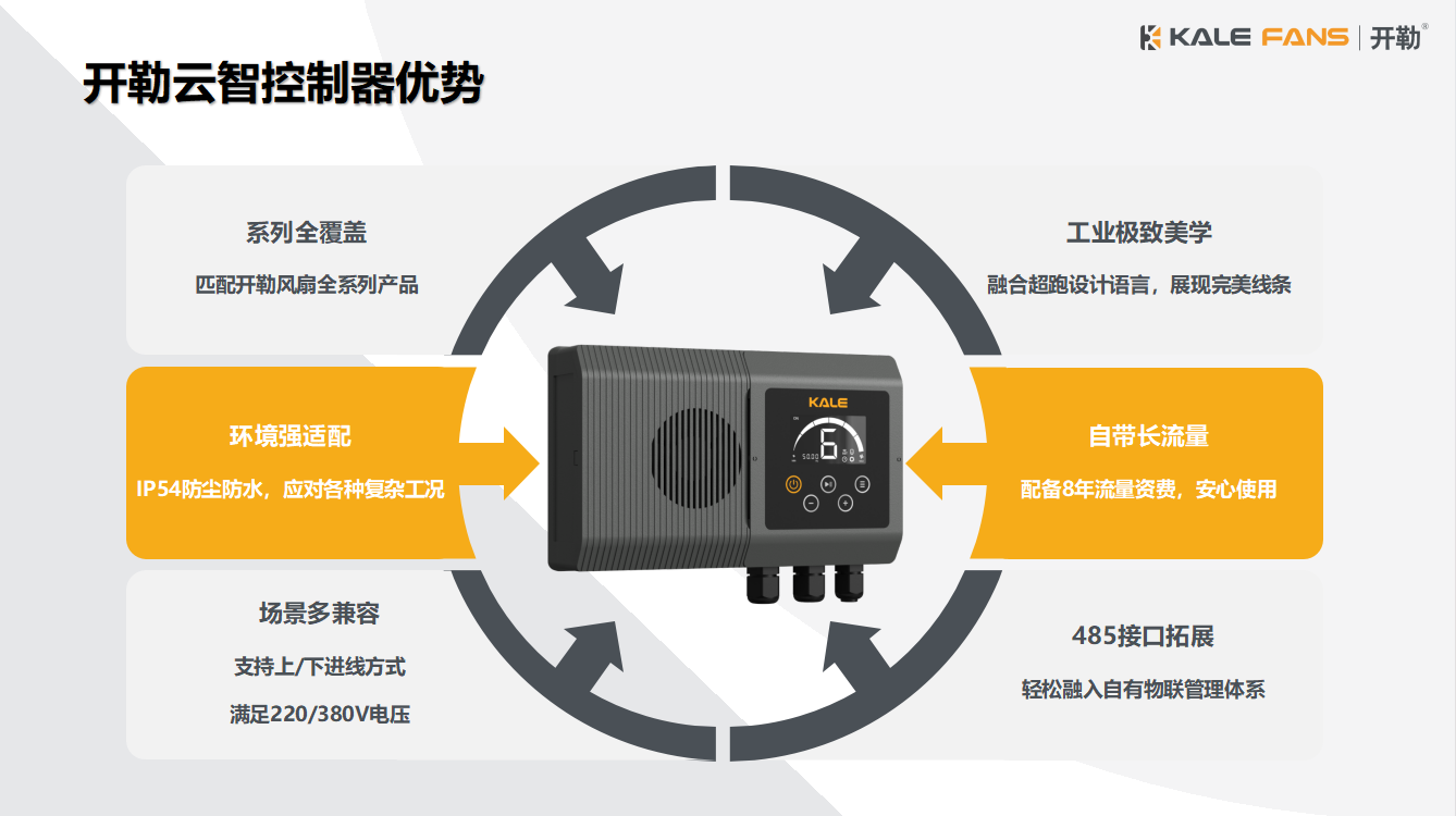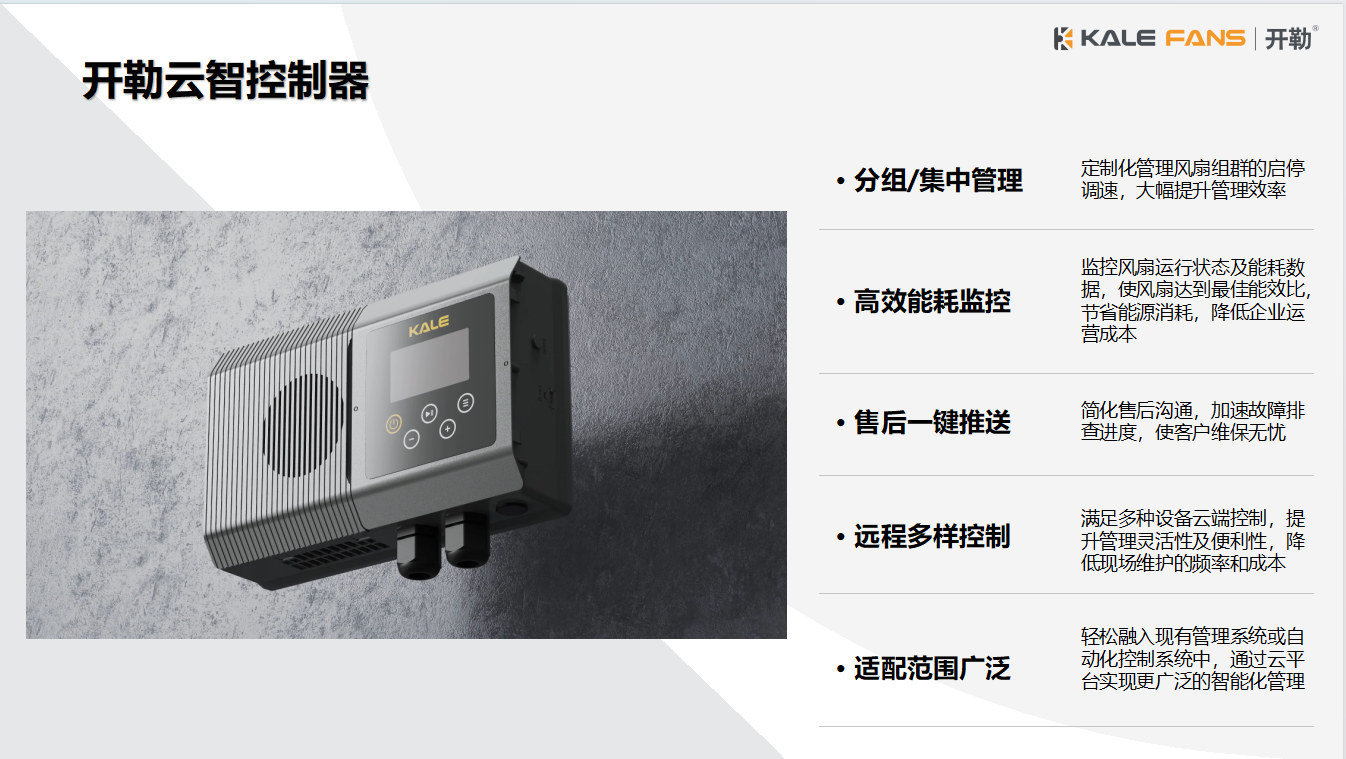 開勒云智控制器是開勒為行業(yè)自主研發(fā)的物聯(lián)網控制器,集成智能控制技術和云服務功能。該控制器匹配開勒風扇全系列產品,具備IP54防塵防水能力,適應各種復雜工況。控制器自帶8年流量資費,配備485接口拓展,可輕松融入自有物聯(lián)管理體系。通過云平臺,用戶可以實現風扇能耗數據全紀錄、信號傳感器聯(lián)動(如行車檢修通道自動鎖定風扇)、煙霧傳感器自動停機或反轉排煙、溫濕度傳感器自動調節(jié)轉速等功能。