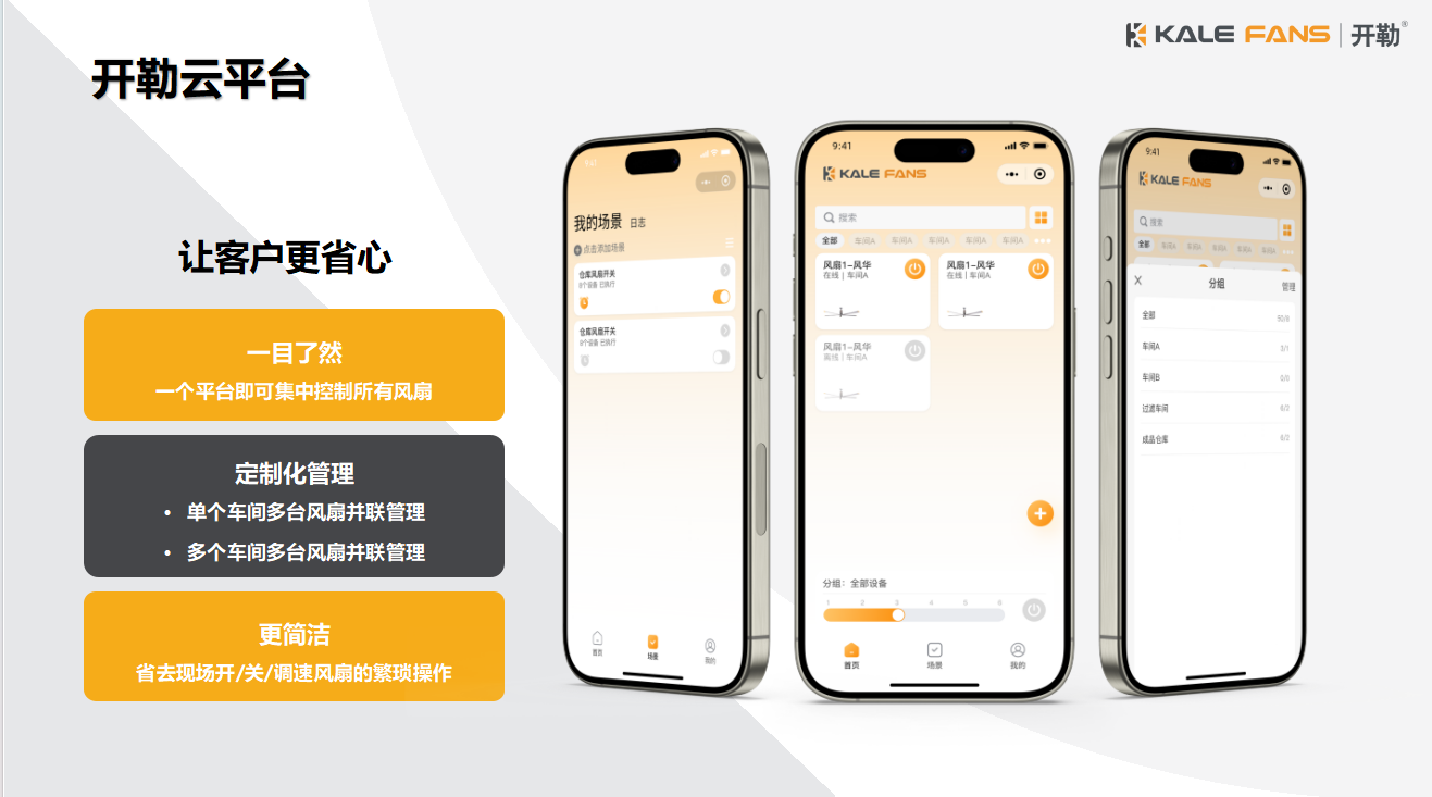 遠程操控:支持手機、平板、PC多平臺實時調整風扇轉速、監(jiān)控能耗數據,隨時隨地輕松掌控。集中管理:自由分組管理風扇組群,管理臺數無上限,一目了然。智能啟停:每日每周定時自動啟停,避免能源浪費。環(huán)境感知:可擴展溫濕度等各類傳感器進行智能控制,自動調節(jié)轉速。智能運維:故障提醒自動推送售后,遠程排故讓客戶放心。