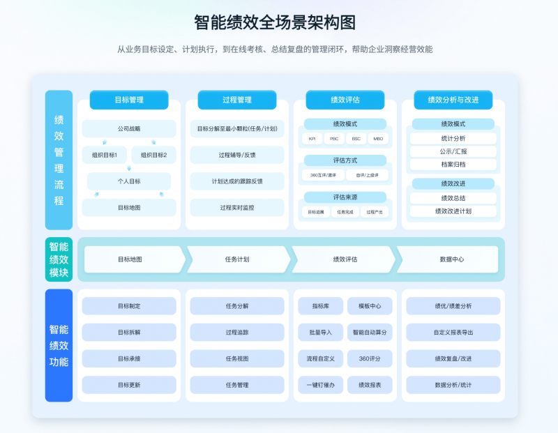 藍凌叮當智能績效的核心定位是“幫助企業實現績效管理全流程閉環”,從業務目標設定、計劃執行,到在線考核、總結復盤,覆蓋企業從初創成長到規模擴張的全階段需求,支持自定義考核流程,滿足KPI、360環評、OKR等不同業務形態的評估模式,具體功能可分為五大核心模塊:
