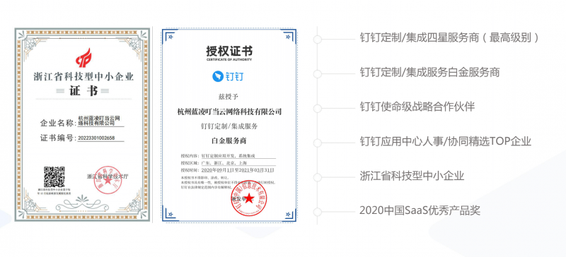 在資質榮譽上,藍凌叮當斬獲多項權威認可,包括釘釘使命級戰略合作伙伴、釘釘定制/集成四星服務商(最高級別)、釘釘應用中心人事/協同精選TOP企業、浙江省科技型中小企業、2020中國SaaS優秀產品獎,其智能績效產品更入選中國通信院2025“鑄基計劃”全景圖,技術實力與行業認可度均處于行業前列。此外,藍凌叮當擁有一支年輕化團隊,超過85%的員工為90/95后,更貼近新一代用戶需求;同時實現90%以上業務線上化,能為成長性企業提供高效的數字化運營支持。