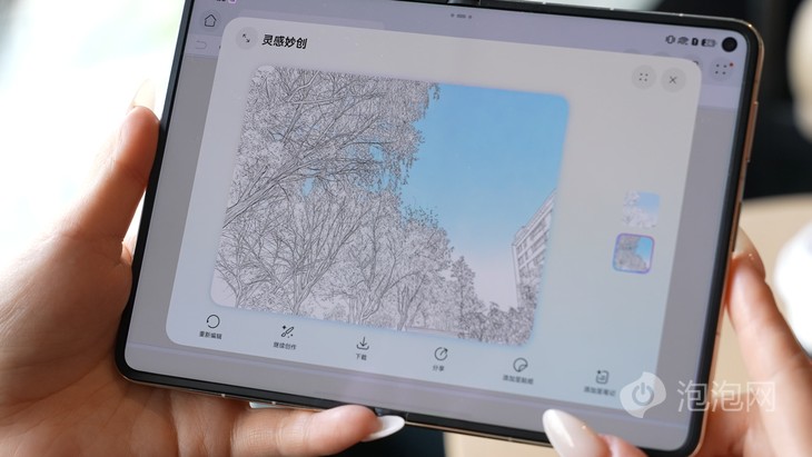AI創作功能也很強,華為筆記里的AI靈感妙創只要隨手涂鴉、拍張照片,就能生成表情包、日常穿搭、家裝效果圖,手殘黨也能秒變設計師。它還在手機上首發天生會畫App,各種筆刷都有,隨手畫畫、給照片加創意,可玩性很高。