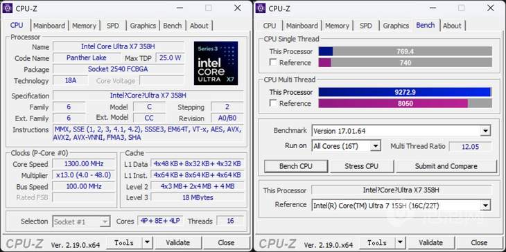 首先是大家熟悉的CPU-Z,Ultra X7 358H單核得到789.5分,多核成績為6449.6分,單核成績和多核成績都表現不錯,日常使用乃至輕度生產力工作都能夠勝任。