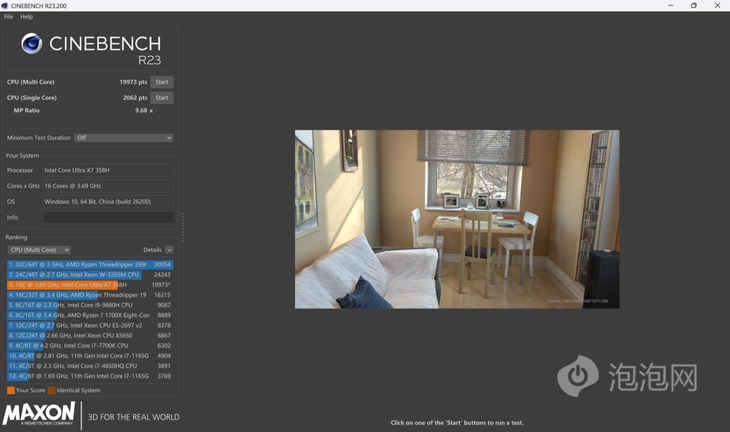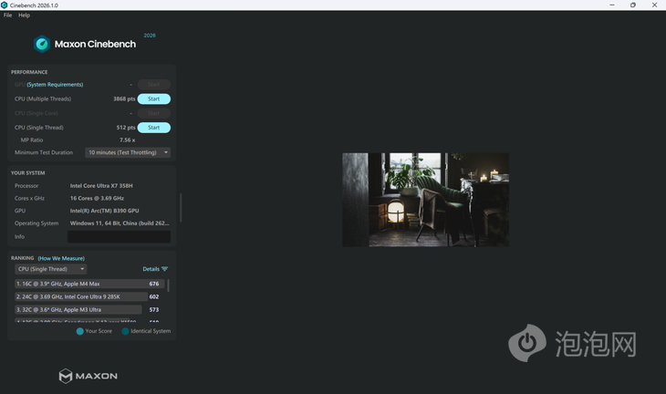 在最新版本的Cinebench 2026當中,Ultra X7 358H處理器多核成績5157pxs,單核成績 683pxs,跑分成績非常不錯,有著旗艦級移動處理器的水平。