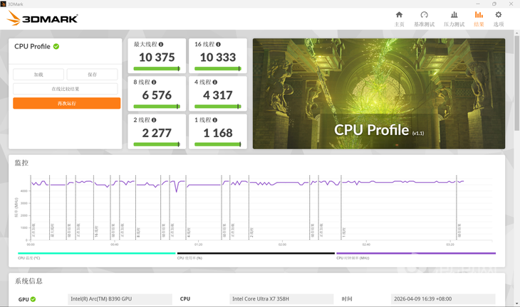 而在3DMark CPU Profile測試當中,酷睿Ultra X7 358H在1線程測試中得到1168分,最大線程成績103375分。整體來看,Ultra X7 358H處理器擁有出色的單核和多核性能表現,對于有多任務需求的職場人士以及創意工作者來說都能夠滿足日常辦公使用以及簡單的視頻剪輯等生產力需求工作。
