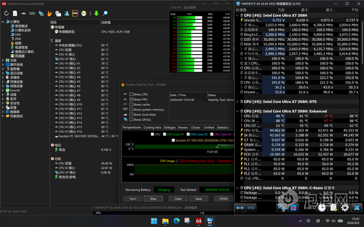 那么華碩破曉Ultra在輕薄的機身下,性能釋放表現如何呢?華碩破曉Ultra配備了ExpertCool Pro冰鋒散熱系統,采用雙風扇+內吹結構設計,這套散熱系統不僅能讓處理器在高負載下穩定運行,還做到了優秀的噪音控制。我們使用AIDA64的15分鐘壓力測試來看看實測表現如何。測試結果來看,華碩破曉Ultra的CPU核心溫度平均為88°C,此時CPU的功耗釋放平均為45.553W,性能核頻率穩定在3.5GHz左右,這樣的持續性能釋放表現還是相當不錯的,對于一款超輕薄本來說顯然超出了預期。
