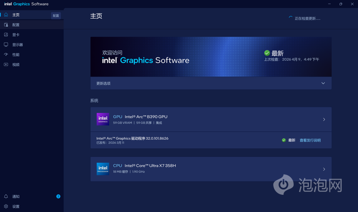 圖形性能方面,這顆處理器集成了英特爾Arc B390核顯,擁有12個Xe3核心,是目前英特爾移動處理器中頂級的集成顯卡,其性能表現超越了低功耗版的RTX 3050,能輕松應對PS修圖、PR短視頻剪輯、輕度3D建模等創意工作,甚至在1080P高畫質下流暢運行部分3A游戲,徹底打破了“輕薄核顯本只能做基礎辦公”的固有認知。而且,在英特爾驅動軟件當中還可以將64GB的超大內存最高分配給核顯近59GB,無論是本地進行AI生成還是跑大模型都擁有充足的顯存。下面我們就借助簡單的實測來看看這顆核顯的表現如何。