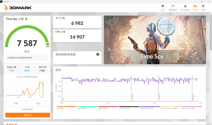 在3DMark跑分測試中,英特爾Arc B390核顯表現出色,Time Spy顯卡分為6982分,Fire Srike顯卡分為16780分,出色的成績甚至達到了當下一些入門級游戲獨顯的水平,表現相當出色。