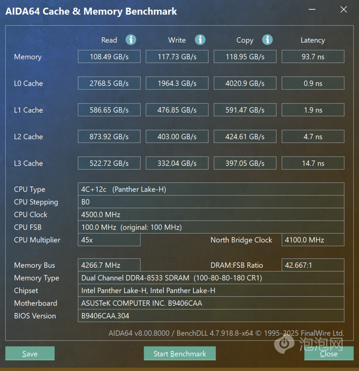 與處理器相匹配的,是華碩破曉Ultra拉滿的存儲規格,標配64GB 8533MT/s LPDDR5X高頻內存超大容量的高頻內存為多任務并行、大型軟件運行、本地AI模型部署提供了充足的運行空間。在AIDA64 Cache&Memory Benchmark的測試中,內存讀取、寫入、復制速度分別為108.49GB/s、117.73GB/s、118.95GB/s,速度相當迅猛,93.7ns的延遲表現相較同類產品也更低。