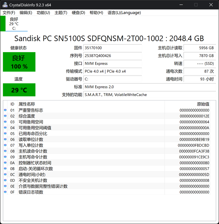 儲存方面,通過CrystalDiskInfo可以看到,華碩破曉Ultra采用了來自剛剛與西數拆分閃迪的SN5100S 2TB PCIe 4.0 SSD,作為原來的藍盤系列產品,擁有主流旗艦水平的PCIe 4.0表現和2TB大容量。我們也通過CrystalDiskMark測試了這塊硬盤的讀寫速度。