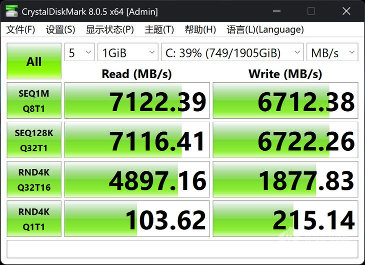 從測試結果來看,該硬盤連續讀寫速度分別為7122.39 MB/s、6712.88 MB/s,4K隨機讀寫速度達到了103.62 MB/s和215.14 MB/s,速度接近了旗艦PCIe 4.0 SSD的水平,搭配2TB的大容量,充分滿足日常使用和游戲的需求。華碩破曉Ultra還支持用戶組建RAID0/1陣列,兼顧了拓展性與數據安全。
