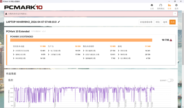 在PCMark10 Extended整機性能測試中,華碩破曉Ultra常用基本功能得分11980,生產力得分為18559,數位內容創作得分為13985,游戲得分為11540,綜合得分為,10735,擁有出色的表現,不但能夠保證日常辦公等場景下的流暢使用,還可以勝任輕度生產力、創作以及游戲的需求。