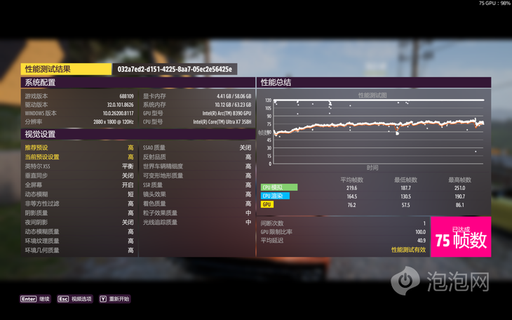 在性能要求更高的《極限競速:地平線5》當中,華碩破曉Ultra在原生2.8K分辨率,高預設,Xess平衡設定下下可以跑到75幀,要知道這可是開啟了光線追蹤的幀數,表現好的出乎意料。