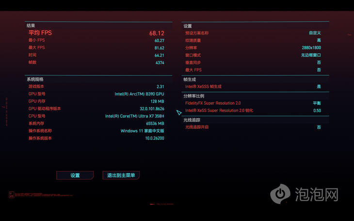 在《賽博朋克2077》中,原生分辨率下最高預設,關閉光線追蹤,開啟超分和幀生成后,華碩破曉Ultra可以跑打破68幀,雖然不高但是也足以游玩了,畢竟這是在2.8K的原生分辨率下,表現確實已經非常強悍了。