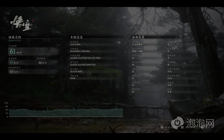 而在對性能要求更高的《黑神話:悟空》。同樣在與原生分辨率、高畫質、超采樣分辨率50,并且關閉光線追蹤,開啟XeSS和幀生成后,平均幀可以達到61幀,也已經達到了流暢游玩的程度。整體來看,華碩破曉Ultra在全新Ultra X7 358H以及出色性能釋放的加持下,甚至可以在原生分辨率下以中高檔畫質游玩對性能要求較高的3A大作,這樣的表現是過往的核顯輕薄本無法想象的。