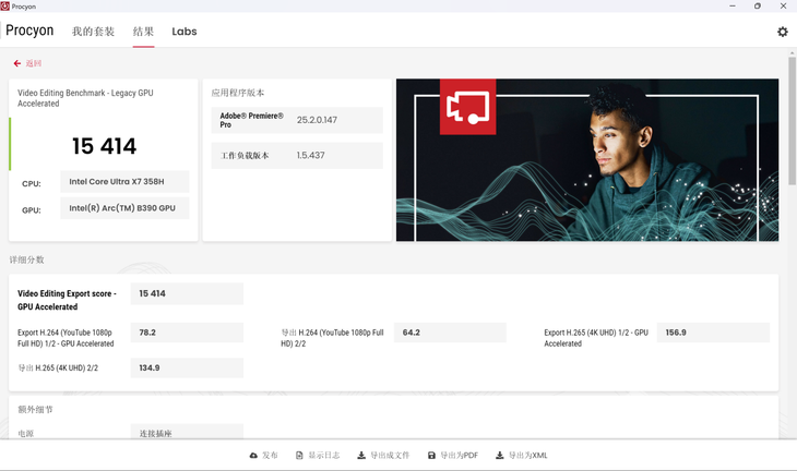 游戲當中表現不俗,我們也使用UL Procyon來看看,華碩破曉Ultra在日常的圖片和視頻處理當中有著怎樣的表現。首先來看看UL Procyon視頻剪輯測試,華碩破曉Ultra在開啟GPU加速后,在基于Adobe Premire Pro的視頻編輯場景中得分為15414分可以輕松勝任日常簡單的視頻剪輯工作,讓你享受更加“輕松”的創作體驗。