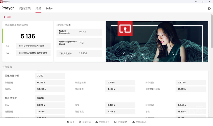 而在UL Procyon中的照片編輯基準測試當中,華碩破曉Ultra得到5136分,在圖像修飾以及批處理兩個項目當中都有著非常不錯的表現。這樣的性能表現也能夠滿足攝影師快速調色,出圖的需求了。