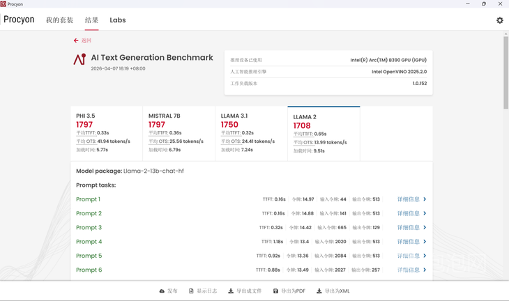 而在UL Procyon AI Text Generation Benchmark中,針對各類本地大模型的加載以及輸出token的速度,華碩破曉Ultra的表現也十分出色,在四款大模型的平均延遲和每秒Token數量上都有著出色的表現,證明其性能可以充分滿足上述AI大模型的使用需求。