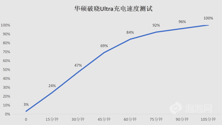 充電方面,華碩破曉Ultra標配了90W電源適配器。實測華碩破曉Ultra充電50%僅需30分鐘左右,一小時即可充至85%左右,速度非常快,外出使用之后也能快速回血。