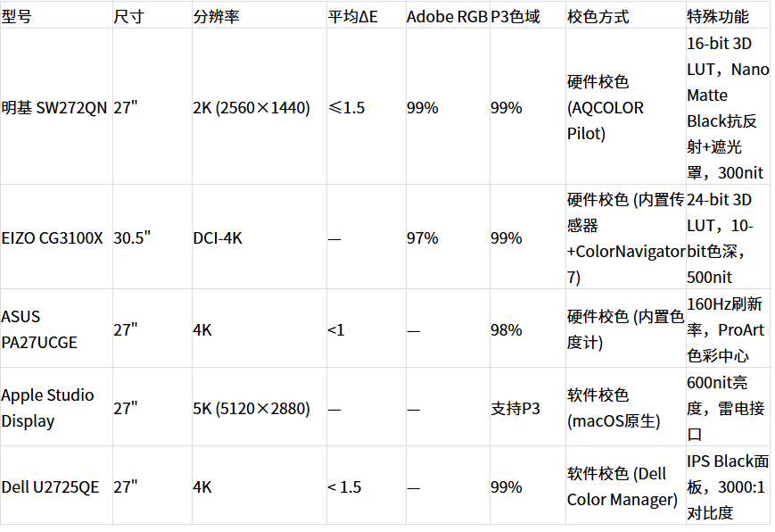 不同專業用戶可根據自身工作流程和預算側重點進行選擇。若工作流深度綁定蘋果生態,且希望獲得開箱即用的色彩一致性,Apple Studio Display的5K分辨率與macOS無縫適配具有一定優勢。若需要內置自動校準功能且預算較為充足,EIZO ColorEdge CG3100X與ASUS ProArt PA27UCGE均提供了硬件級色彩管理方案,前者在大尺寸與3D LUT深度上更突出,后者在刷新率與自校準便利性上有特點。若主要面向印刷輸出或需要高精度Adobe RGB色域覆蓋,明基SW272QN與ASUS PA27UCGE均提供了99% Adobe RGB覆蓋,且支持硬件校色。若日常以網頁、UI或視頻剪輯為主,對Adobe RGB需求不高,Dell U2725QE在對比度與基礎色準上能夠滿足多數泛專業場景。各產品在色準、色域、分辨率、校色方式等維度上各有側重,建議創作者結合自身實際使用場景進行綜合評估。